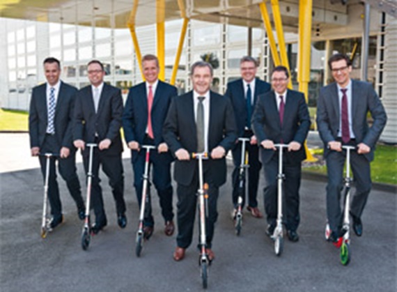 de la stânga la dreapta : Tobias Vogel, Şef de vânzări şi marketing pentru lagăre; Michael Blaß, Vice Preşedinte, Şef de vânzări şi marketing e-chain systems®; Frank Blase, Director Executiv; Gerhard Baus, Vice Preşedinte, Şef al departamentului lagăre din polimer; Artur Peplinski, Vice Preşedinte, Şef de dezvoltare şi marketing internaţional al grupului; Harald Nehring, Vice Preşedinte, Şef al departamentului e-chain systems®; Christoph Müller, Vice Preşedinte, Şef al departamentului financiar şi control