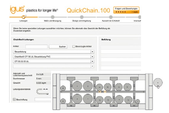 igus® a prezentat primul energy chain fabricat din plastic acum 43 de ani; azi, compania oferă cea mai mare gamă de lanţuri din plastic, cu cea mai largă gamă de cabluri flexibile din lume. Pentru a parcurge gama largă, clienţii pot utiliza un instrument online pentru a-şi selecta cu uşurinţă lanţul cu cabluri şi conectori şi chiar a calcula durata de viaţă. Astăzi, igus® este un furnizor de sisteme în domeniul alimentării cu energie. Sistemele readychain® sunt oferite sub formă de unităţi finisate, asamblate la comandă.