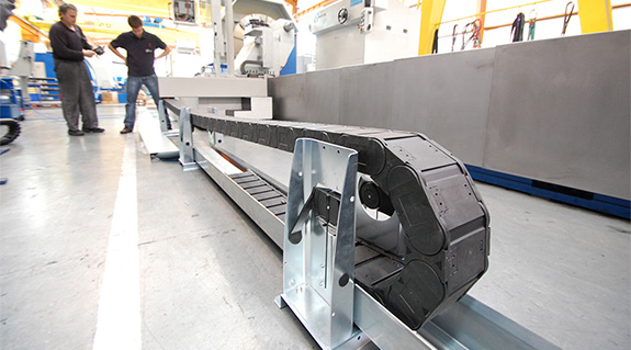 Several plastic energy chains ensure cable guidance at high travel speeds and accelerations in Grenzebach Maschinenbau GmbH cutting machines.